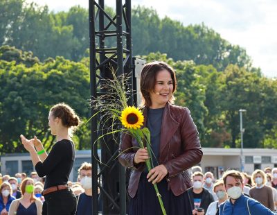 Foto-von-Marcus-Roth-Kanzlerkandidatin-Annalena-Baerbock-lachend-mit-Sonnenblume-in-den-Haenden