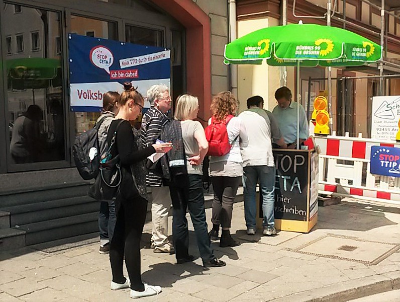 Die Grünen in Regensburg beteiligen sich an der Unterschriftensammlung für ein bayerisches Volksbegehren gegen das umstrittene Freihandelsabkommen CETA zwischen der EU und Kanada. Damit möchte ein breites Bündnis von Organisationen und Parteien die bayerische Staatsregierung dazu zwingen, im Bundesrat gegen CETA zu stimmen und damit das Abkommen zu Fall zu bringen. Nötig sind dafür in einem ersten Schritt 25.000 Unterschriften. Möglichst viele davon sollen am kommenden Aktionssamstag am 16. Juli an rund 500 Infoständen in ganz Bayern gesammelt werden. Zwei der Stände stehen auch in Regensburg am Bismarckplatz und am Arnulfsplatz von 10 bis 16 Uhr. Diese Stände organisieren wir gemeinsam mit der GRÜNEN JUGEND Regensburg und anderen Organisationen.