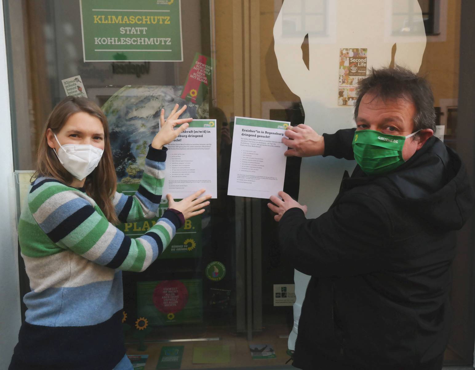 Die Regensburger Grünen setzen sich für bessere Arbeitsbedingungen und die Wertschätzung von Pfleger*innen, Erzieher*innen und Fachkräften in sozialen Einrichtungen ein. Sie fordern mehr Personal, einem verbindlichen Tariflohn mit festen Zuschlägen, geregelten Arbeitszeiten, einer kostenlosen Ausbildung und mehr Möglichkeiten zur Weiterbildung. Dafür hängten die Grünen fiktive Stellenanzeigen in Regensburg aus, um zu zeigen, welche Arbeitsbedingungen Menschen in sozialen Berufen tatsächlich verdient hätten. Die Aktion unter dem Motto #InZukunftGerecht wurde von Eva Lettenbauer initiiert, die Parteivorsitzende der bayerischen Grünen ist.