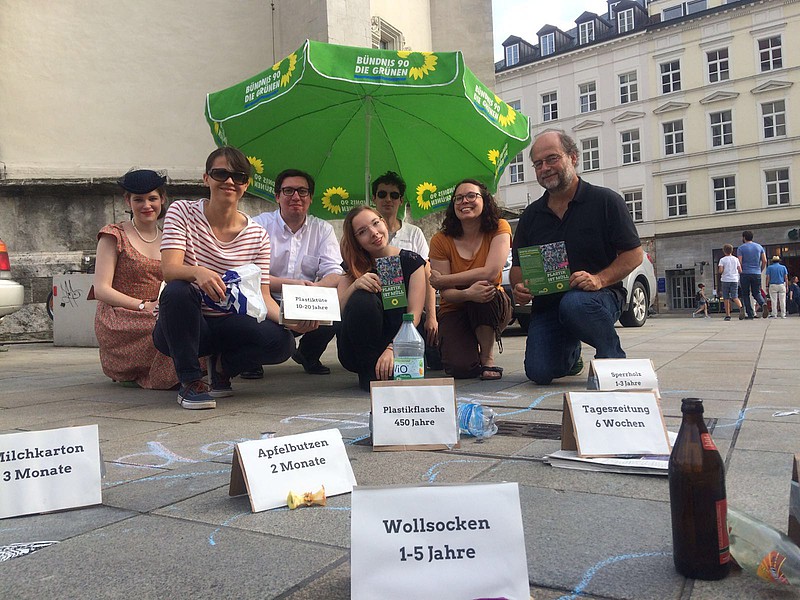 450 Jahre belastet eine Plastikflasche die Natur, bis sie von der Umwelt abgebaut ist. Erstaunt stehen die Passanten auf dem Regensburger Neupfarrplatz und lassen die Zahl auf sich wirken. Wenn Kolumbus bei der Entdeckung Amerikas Plastikflaschen im Ozean hinterlassen hätte, würde man heute noch Reste davon finden. Veronika Zeichinger, Ortsvorsitzende der Grünen in der Regensburger Altstadt und Initiatorin des Aktionstages erläutert: „Vom alltäglichen Verpackungsmüll bis hin zum berüchtigten Mikroplastik, landet ein großer Teil unseres Plastikmülls in heimischen Gewässern.“ Schon heute gibt es in der Donau stellenweise mehr Plastikteilchen als Fischlarven. Und schon heute sterben jährlich Millionen Seevögel, Fische und Meeressäuger an Plastikmüll. „Wenn das so weitergeht, wird im Jahre 2050 mehr Plastik als Fische im Meer zu finden sein.“