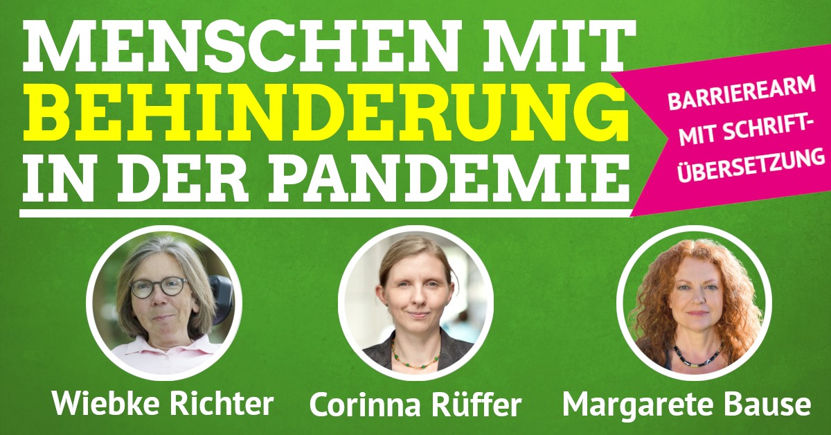 Zwischen Gesundheitsschutz und Freiheit – in diesem Spannungsfeld bewegen wir uns gerade alle. Doch Menschen mit Behinderung sind in ganz besonderer Weise davon betroffen. Auf Einladung von unserer Grünen Stadträtin, Wiebke Richter, diskutieren Margarete Bause, menschenrechtspolitische Sprecherin der Grünen im Bundestag, und Corinna Rüffer, behindertenpolitische Sprecherin der Grünen Bundestagsfraktion, über den Umgang von und mit Menschen mit Behinderung mit der Pandemie und ihren Schwierigkeiten