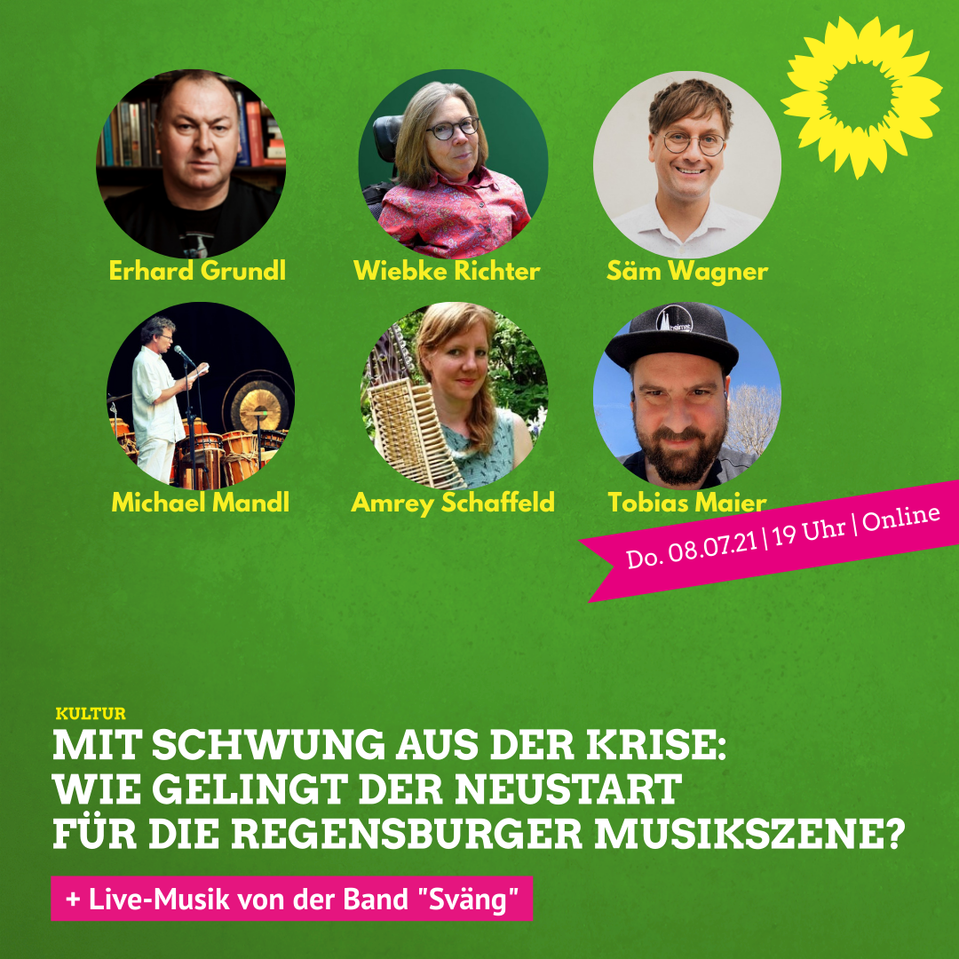 Über diese und weitere Fragen spricht Wiebke Richter, Kandidatin der GRÜNEN auf der bayerischen Liste zur Bundestagswahl, mit dem kulturpolitischen Sprecher der Grünen im Bundestag Erhard Grundl, der Musikerin Amrey Schaffeld von der Regensburger Band Sväng, dem Popularmusikbeauftragten der Oberpfalz Säm Wagner, dem Initiator des Klangfarbenfestivals Michael Mandl sowie dem Betreiber und Konzertveranstalter der Heimat Regensburg Tobias Maier.
