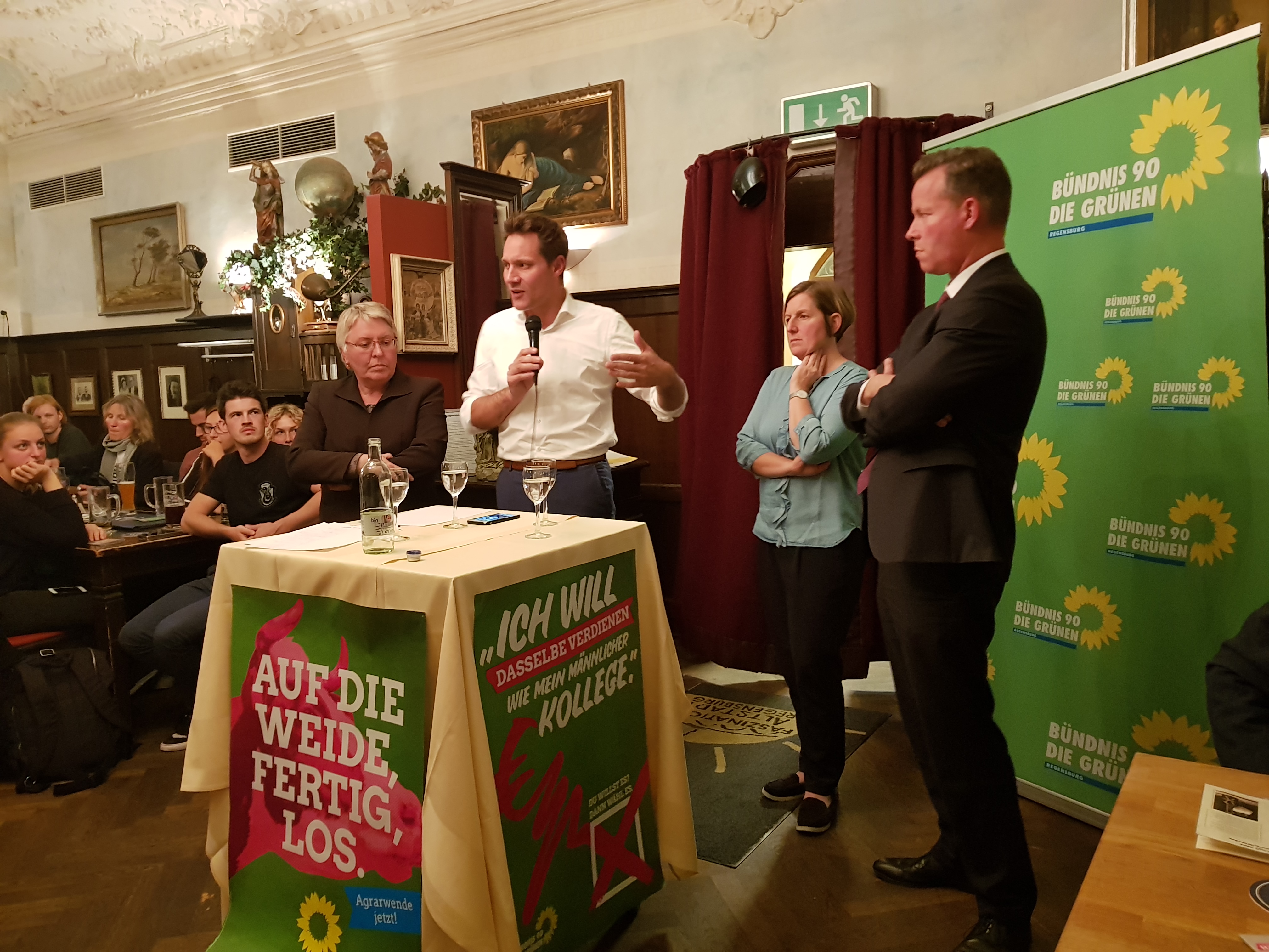Unser Direktkandidat und MdL Jürgen Mistol eröffnete die Veranstaltung und sprach sich für ein weltoffenes Regensburg und ein Europa ohne Schlagbäume aus. Stadtvorsitzende Maria Simon stellte die Gäste des Abends vor: Grünen Fraktionsvorsitzender und Spitzenkandidat Ludwig Hartmann, REWAG- Vorsitzender Olaf Hermes und Lammsbräu-Geschäftsführerin Susanne Horn sind der Einladung zur Podiumsdiskussion gefolgt. In kurzen Statements stellten sie ihre Standpunkte zum Thema Wirtschaft und Umwelt dar.