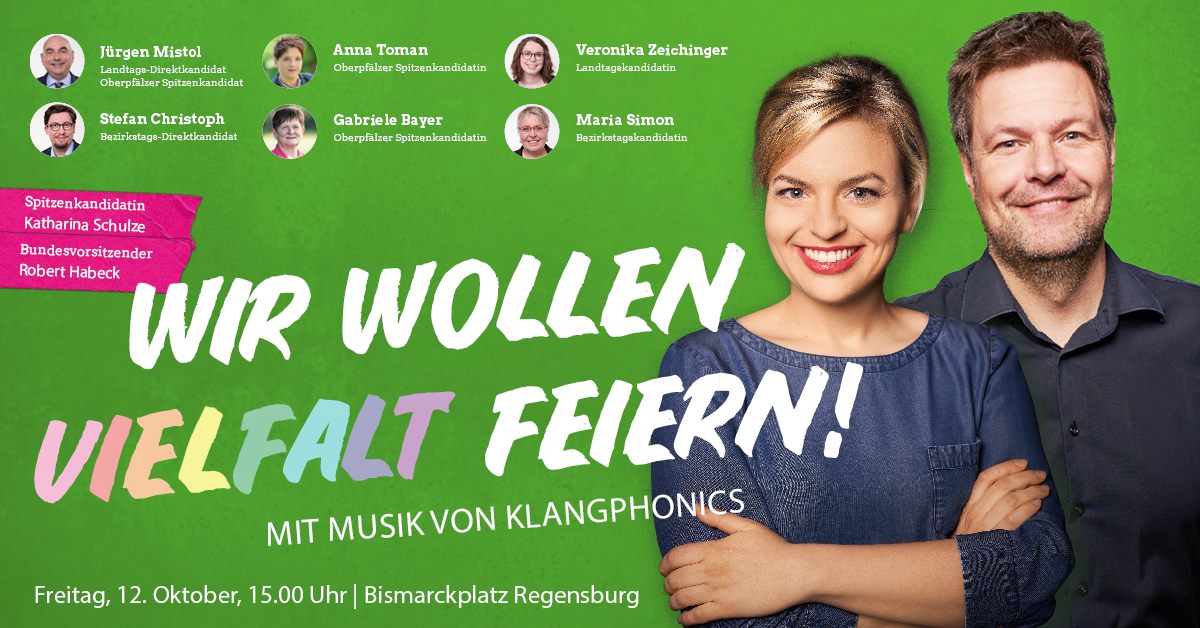 Das Beste kommt wie immer zum Schluss! Diesen Wahlkampf beenden wir mit einen großen bunten Fest und feiern die Vielfalt. Mit unserer bayerischen Spitzenkandidatin, Katharina Schulze und dem Parteivorsitzenden der Grünen, Robert Habeck. Live-Musik von den Klangphonics.